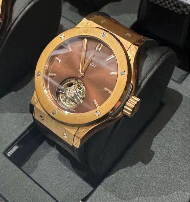 Relógio Hublot Big Bang em ouro. - Caixa em ouro. - Bracelete em pele. - Mostrador com detalhes em ouro.