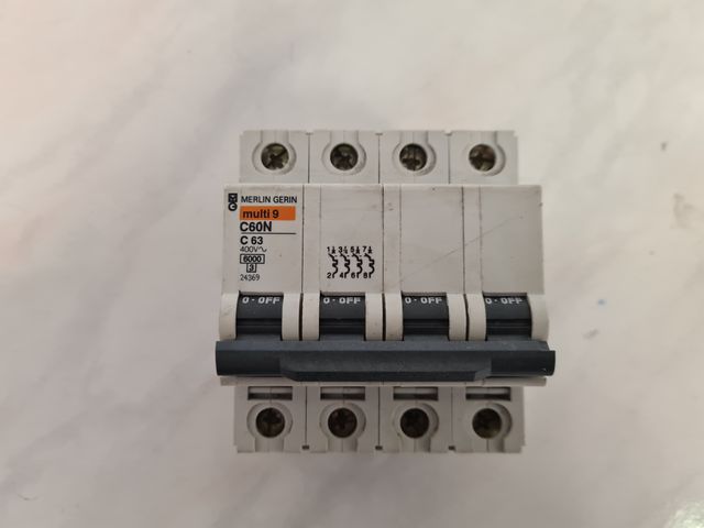 Product detailsInterruptor Magnetotérmico MERLIN GERIN C60N – C 63 serie multi 9 de 63 A de 4 Fases, anchura 4 módulos. Fue utilizado en un cuadro de protecciones de obra hasta que finalizó la obra.