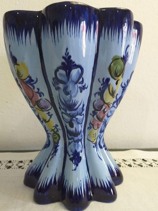 Product detailsJarra em loiça de Alcobaça em forma de 8 gomos, feita à mão com motivos florais em tonscde azul com 19 cm de altura x 16 cm de diâmetro x 12cm de diâmetro da base.