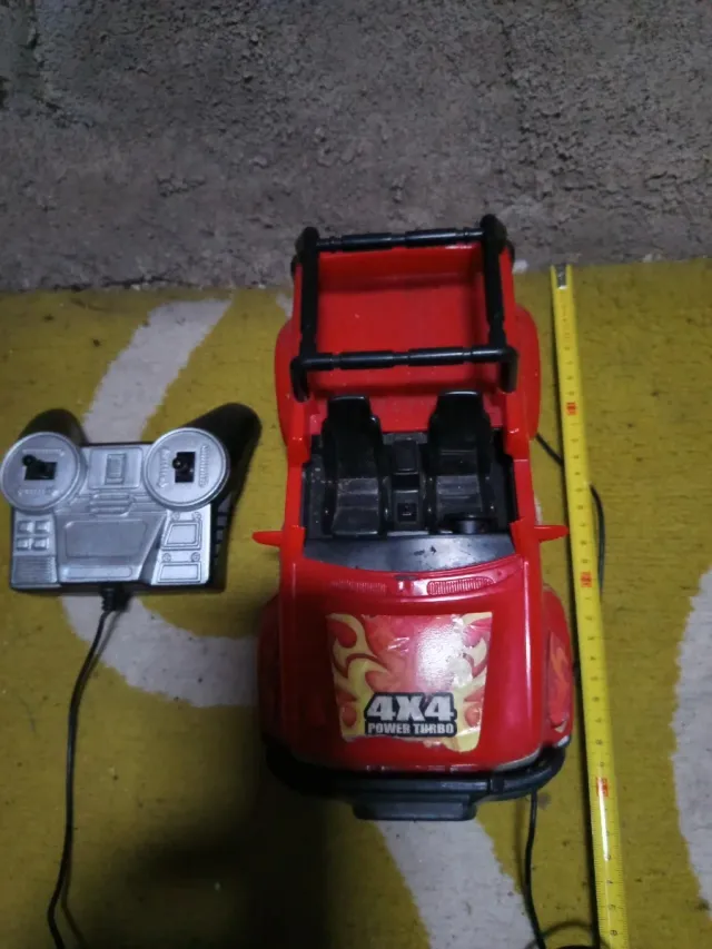 Jipe telecomandado vermelho com design desportivo. - Modelo 4x4 Power Turbo. - Inclui comando. - Detalhes em preto. - Está a funcionar e leva pilhas