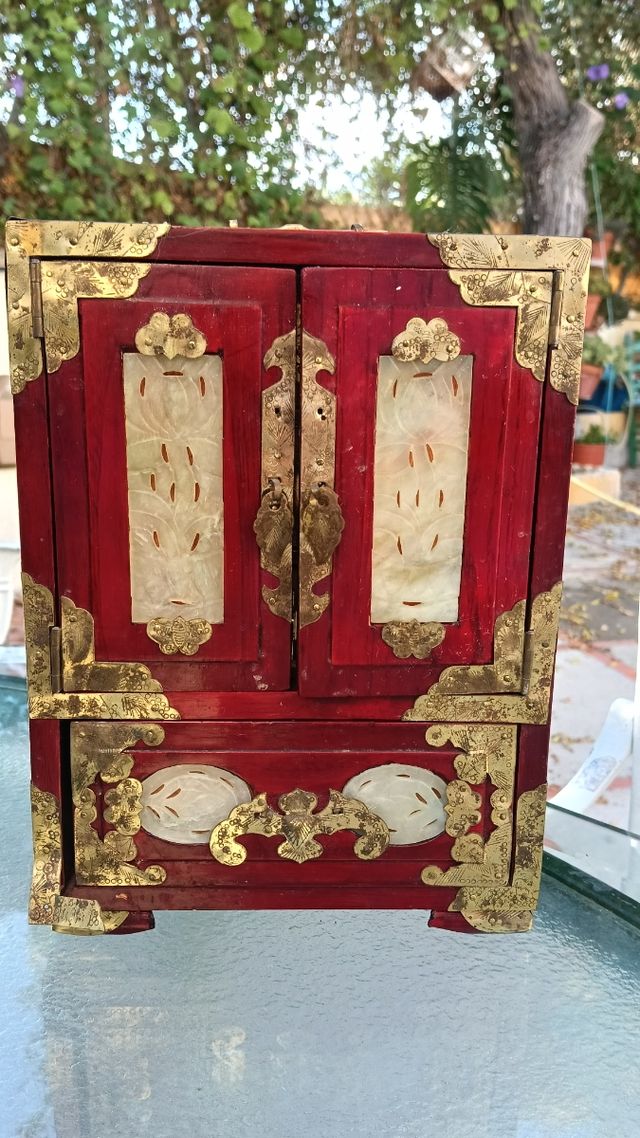 Product detailsElegante joyero de estilo japonés antiguo, con una base de madera oscura y detalles en jade.