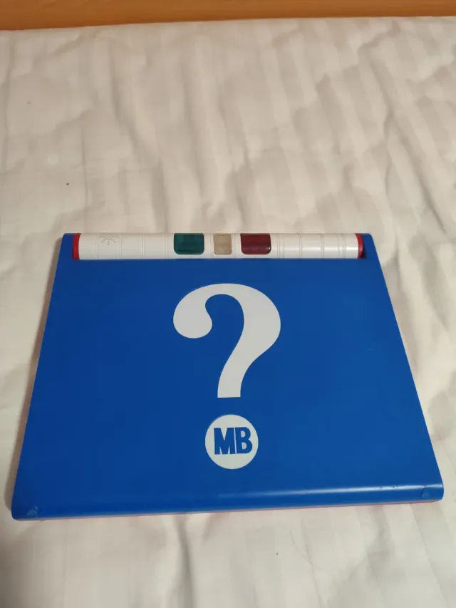 Clásico juego de mesa ¿Quién es Quién? de MB. - Tablero azul con diseño de signo de interrogación. - Marcadores de colores en la parte superior.