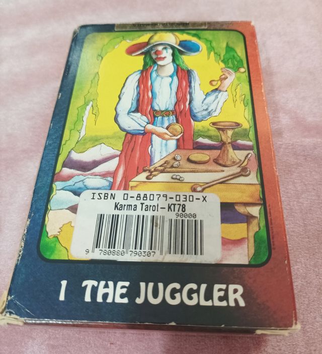 Karma tarot por Birgit Boline Erfut, la caja se ve algo desgastada por el tiempo pero las cartas apenas tienen uso.
