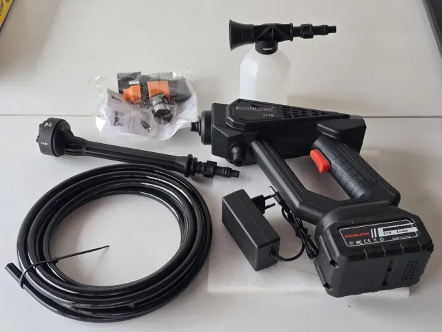 Lavadora de pressão portátil com bateria de lítio de 21v. - Inclui pistola, mangueira e carregador. - Bateria de 21V Li-Ion. - Acessório para espuma.