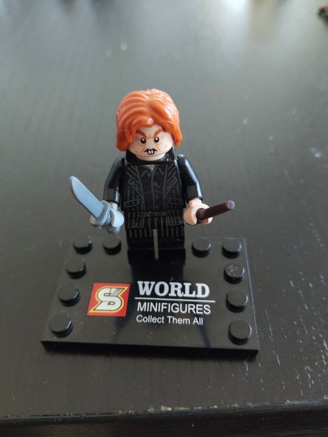 Lego minifigura de Peter Pettigrew del set 75965. Se encuentra en buen estado. - Minifigura articulada. - Incluye cuchillo y varita. - Ideal para coleccionistas.