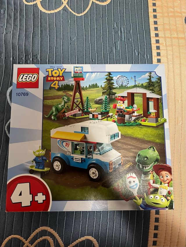 Set de construcción Lego de Toy Story 4. - Incluye personajes como Rex, Jessie, Alien y Forky. - Contiene un vehículo tipo caravana y un puesto de feria.