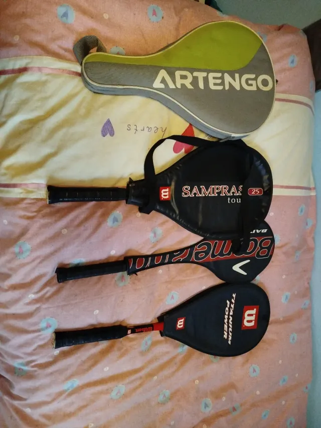 Product detailsConjunto de tres raquetas de tenis, dos de la marca Wilson y una de Artengo.