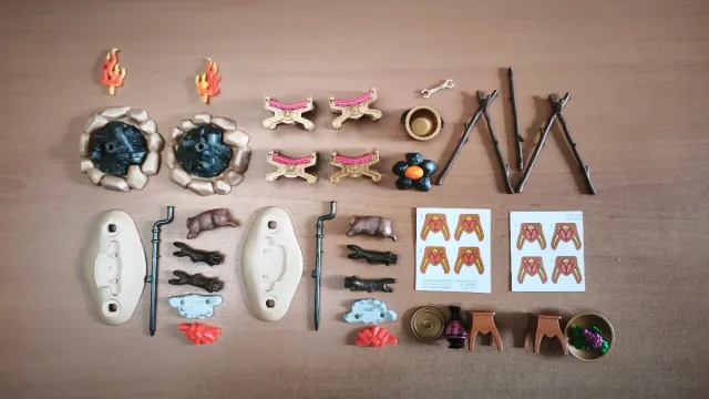 Lote de piezas de Playmobil. - Dos hogueras 9 - Cuatro sillas doradas con cojín rosa 8 - Un caldero 7,50 - Dos asador 16 - una mesa 6 - Una mesa 5 Total 51,50