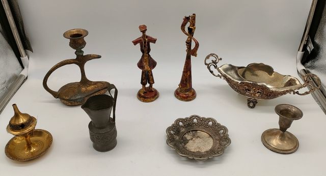 Vendo lotto intero, no separatamente. Vari oggett in metallo + 2 statuine in rame, saldate "a mano" (foto 2). Oggetti rari, di varie epoche, anche antichi.