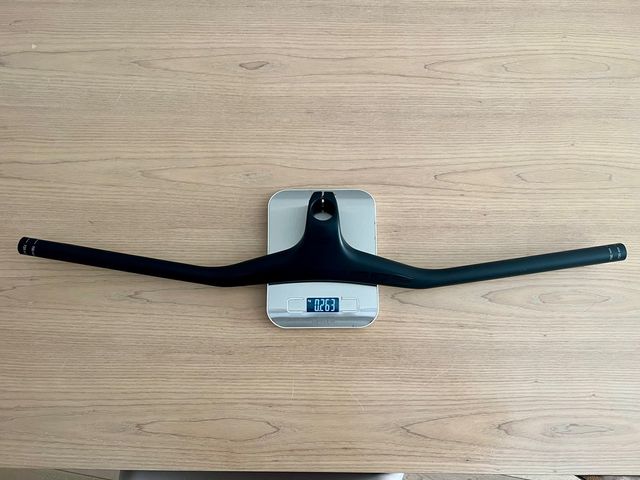 Manillar integrado de carbono. Solo tres meses de uso. 730mm 80mm/-17º 263 gramos Una pequeña marca, inapreciable a simple vista, pongo fotos.