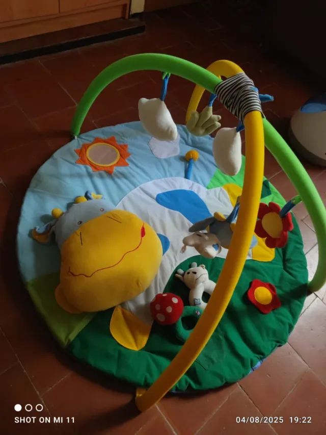 Product detailsManta de juegos colorida para bebés con diferentes texturas y sonajeros colgantes.