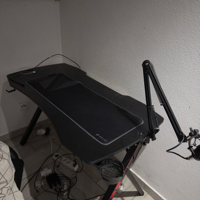 Conjunto de mesa e cadeira gamer. - Mesa com design ergonômico. - Cadeira com suporte para copos. - Braço articulado para microfone.