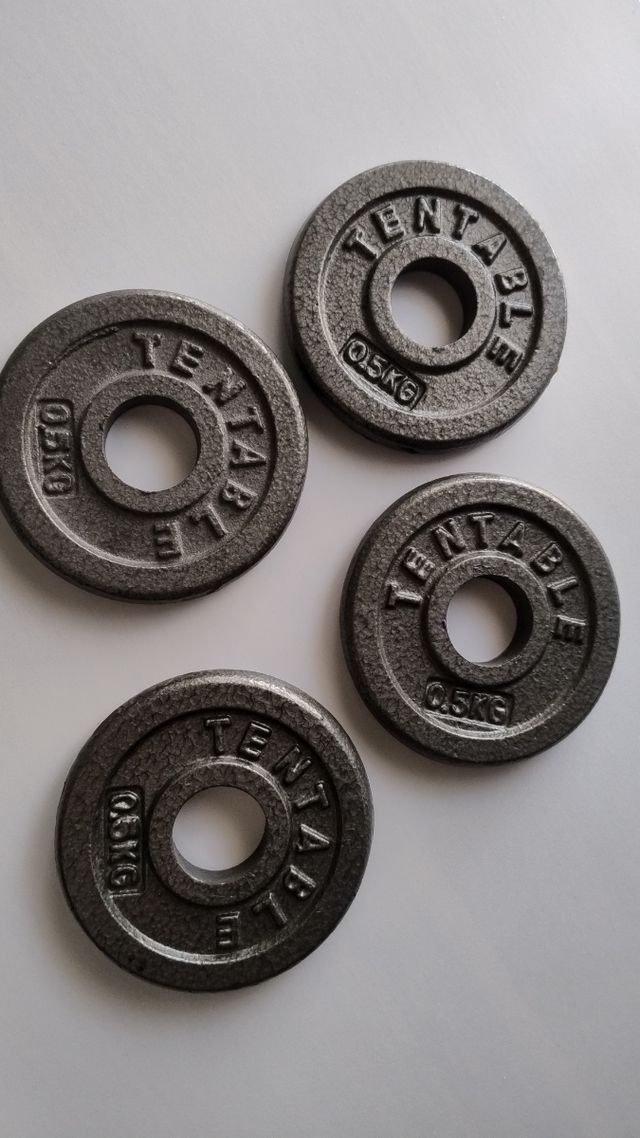 Product detailsSe venden cuatro discos de peso de 0.5kg cada uno. 2kg en total. Diámetro 28mm. Son de hierro fundido, de color gris oscuro y tienen una textura ligeramente rugosa.
