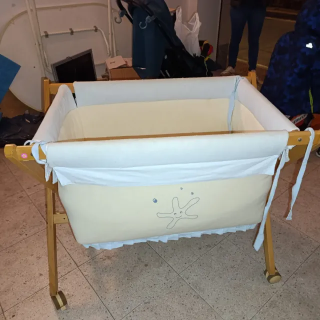 Product detailsMinicuna de madera con un diseño infantil de estrellas y burbujas.