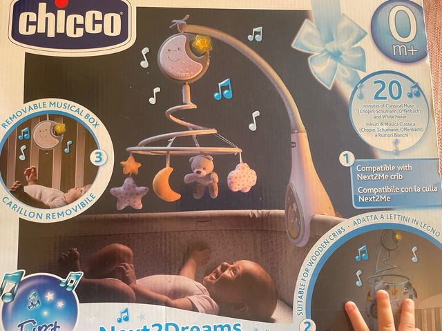 Product detailsMóvil musical para cuna de la marca Chicco, modelo Next2Dreams. Incluye caja musical extraíble.