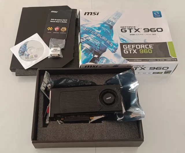 Tarjeta gráfica MSI GeForce GTX 960 con 2GB de memoria. En caja original. - Modelo: GTX 960 - Memoria: 2GB GDDR5 - Interfaz: PCIe 3.0 - Incluye manual y CD de drivers.