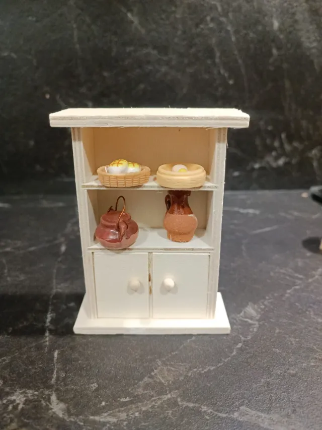 Product detailsMueble alacena de madera, ideal para belenes o casas de muñecas. Presenta un diseño clásico con dos puertas inferiores y dos estantes superiores.