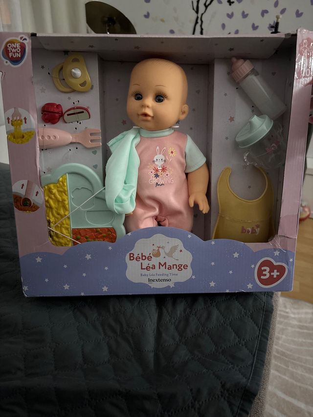 Muñeca interactiva Bebé Léa Mange, ideal para jugar a darle de comer. - Incluye biberón, plato, cubiertos y babero. - Muñeca con ropa. - Edad recomendada: 3+ años.