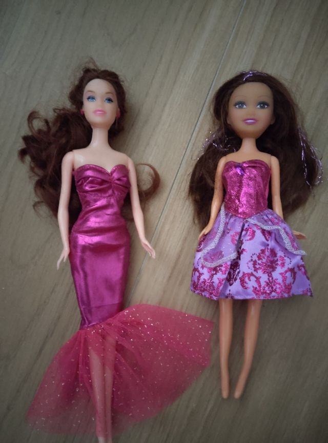 Dos muñecas de moda con vestidos elegantes. - Una muñeca lleva un vestido largo rosa brillante con cola de tul. - La otra muñeca luce un vestido corto morado con detalles brillantes y un lazo.