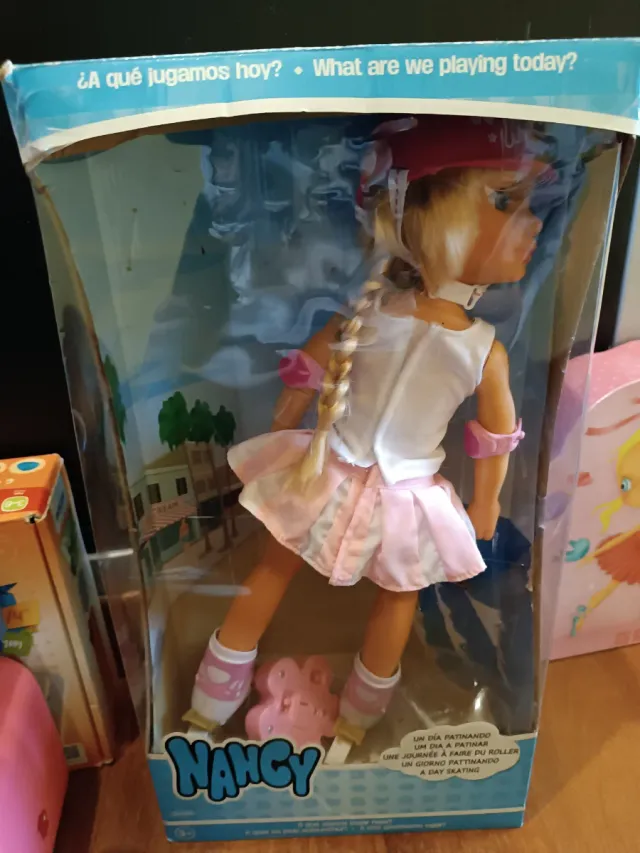 Muñeca Nancy patinadora con patines y accesorios.Practicamente no la ha usado, como nueva - Incluye patines rosas. - Falda rosa y top blanco. - Pelo rubio trenzado.