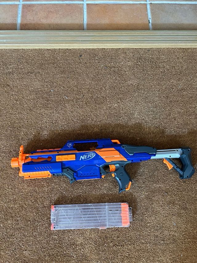 Product detailsNerf Rapidstrike CS-18 totalmente automatica (estilo metralleta) con un cargador largo y trasparente de 18 dardos (también incluido). La pistola funciona con 4 pilas para poder disparar dardos de forma automática.