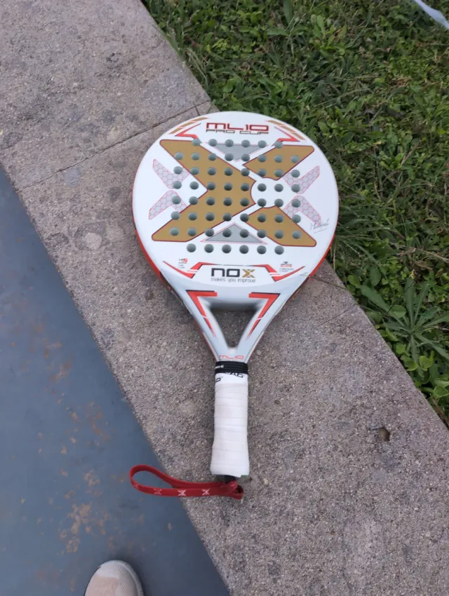 Racchetta da padel Nox ML10 Pro Cup. - Design bianco con dettagli dorati e rossi. - Impugnatura avvolta in nastro bianco. - Laccetto di sicurezza rosso.