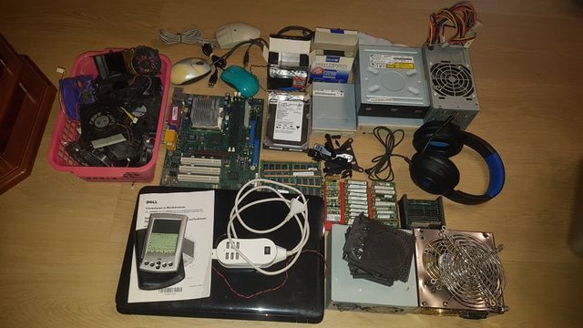 Product detailsVendo pack de componentes de PC. Portátil Dell Vostro (no funciona, no tiene cable cargador ni bateria - Disco Duro y RAM funcionan). 3 Fuentes de alimentación (funcionan). Disco Duro 40GB Seagate (funciona). Unidades de CD-RW/DVD y disquetera con varios disquetes (funcionan). Módulos de memoria RAM y tarjetas WiFi de portatiles (funcionan). Ventiladores de diferentes tamaños (funcionan). Hub USB (funciona). Cables varios SATA (funcionan). Cascos Razer y genéricos (funcionan, uno solo un lado). PDA TCM Placa base con Pentium 3 (funciona). Varios ratones (funcionan, excepto el verde). Anclajes para refriegeración. Para trasteadores.