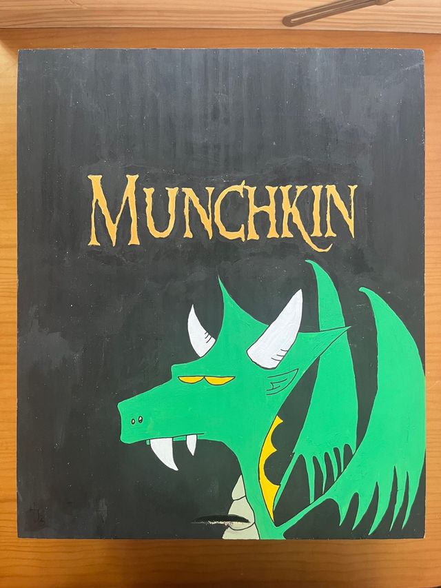 - CAJA DE MADERA pintada a mano, con el nombre Munchkin pintado con pintura dorada metálica y el dragón verde con acrílico.