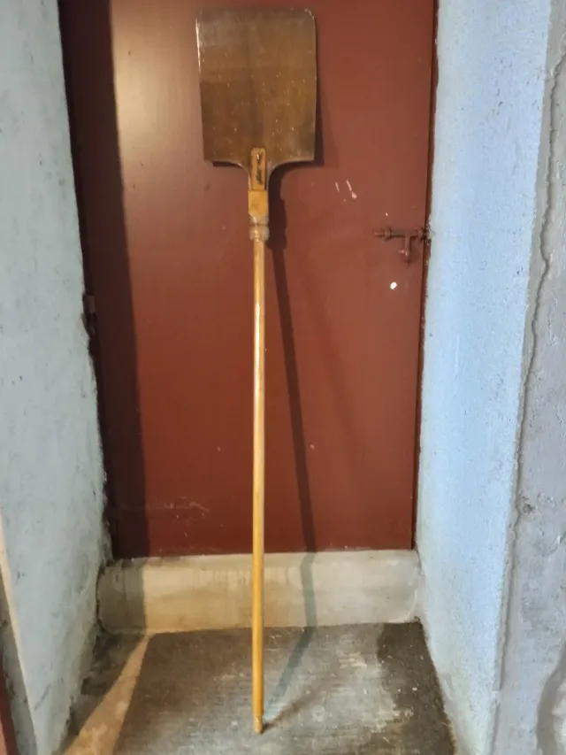 Pala de madera con mango largo, ideal para la recogida de grano. Ha sido restaurada. - Pala de madera. - Mango largo de madera.