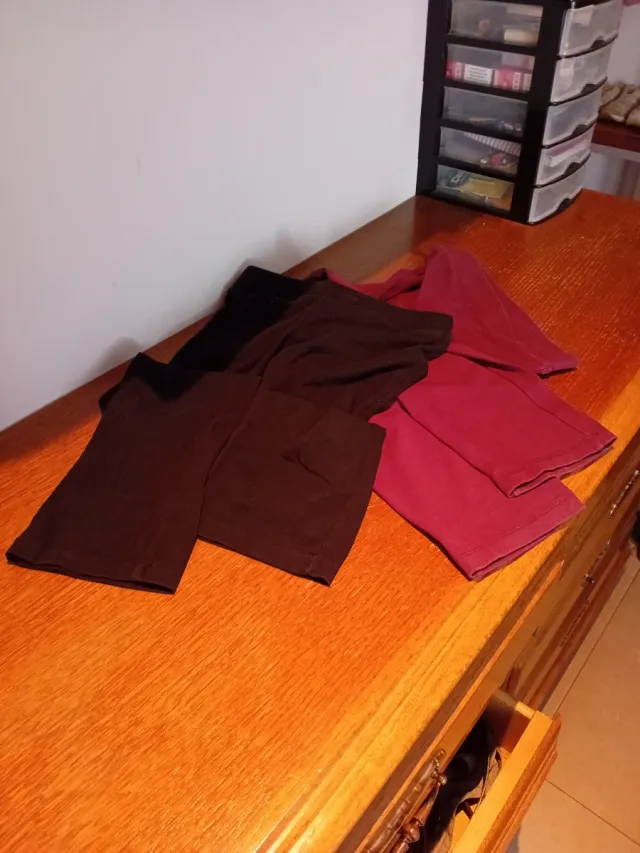 Product detailsConjunto de pantalones o mallas/ leggins de color negro I el mismo modelo de color granate. Son de tela de leggins però un poco anchos de Pibernat. No quedan ajustades de las piernas