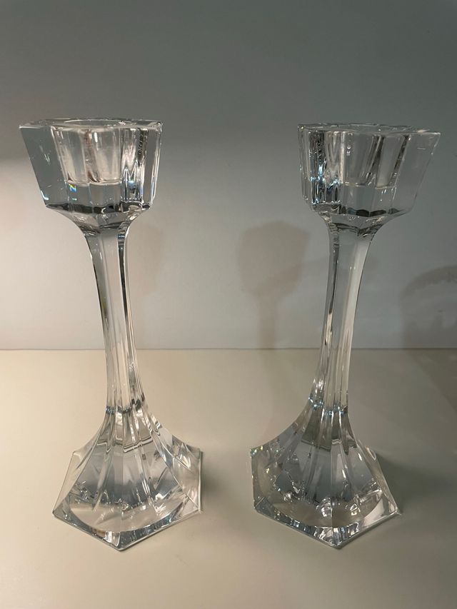 Elegantes castiçais em cristal português, com um design clássico e sofisticado. - Peça decorativa em cristal. - Design clássico e elegante.