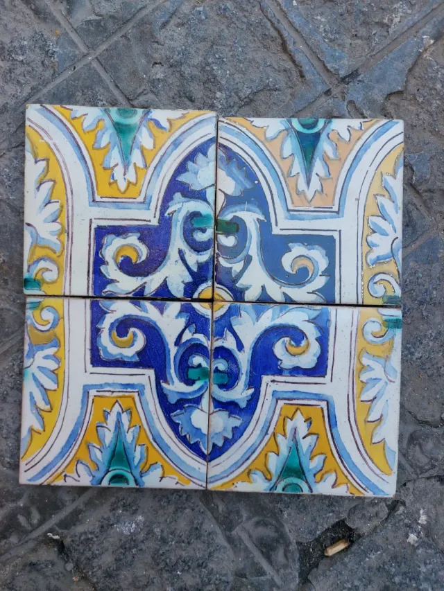 Conjunto de dos azulejos antiguos con un diseño decorativo. - Diseño floral y geométrico. - Colores azul, amarillo y blanco.