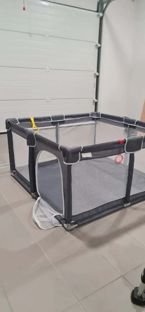 Parque infantil em tecido com estrutura resistente. - Portátil e fácil de montar. - Rede de malha para ventilação. - Inclui um brinquedo pendurado. Tenho ainda o manual