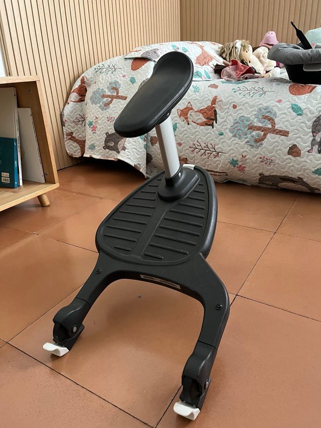 Patinete para cochecito Bugaboo Bee. Se acopla fácilmente al coche. - Plataforma negra. - Asiento integrado. - Ruedas blancas.
