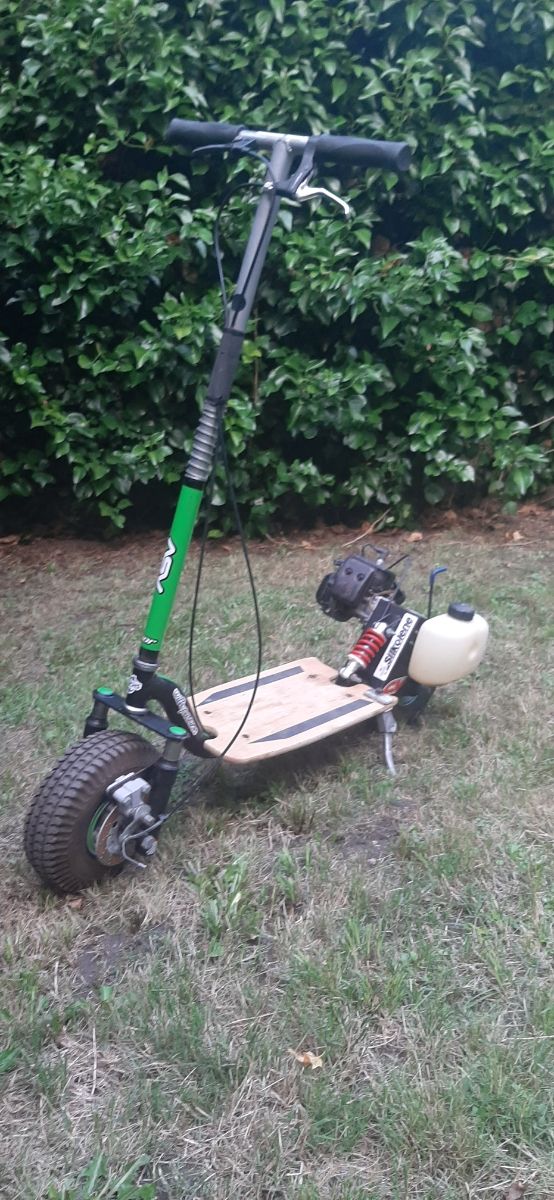Product detailsPATINETE CON MOTOR GASOLINA, un auténtico aparato divertido de gasolina. Arranque perfecto, anda mucho, buen freno, muy estable y con muy poco uso. Manillar plegable y poco consumo. 175 euros.