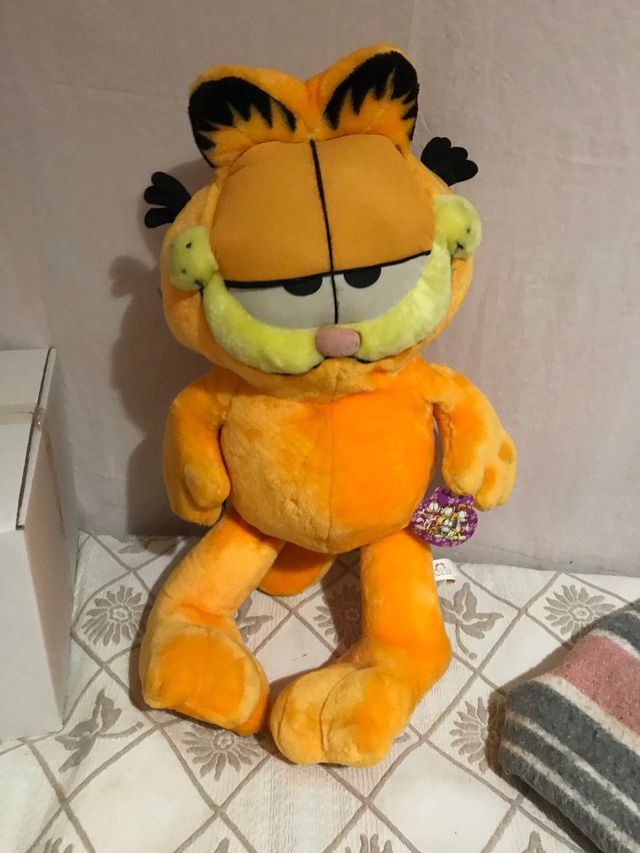 Peluche del famoso gato Garfield. - Color naranja. - Material suave y tierno. - Detalle de etiqueta morada.