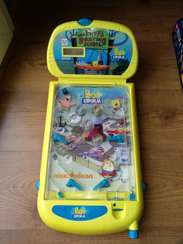 Pinball de sobre mesa Bob Esponja. Tiene sonido, luces y marcador electrónico. Tiene su caja original. Le faltan las dos patas que lo alzan. Ver última foto.