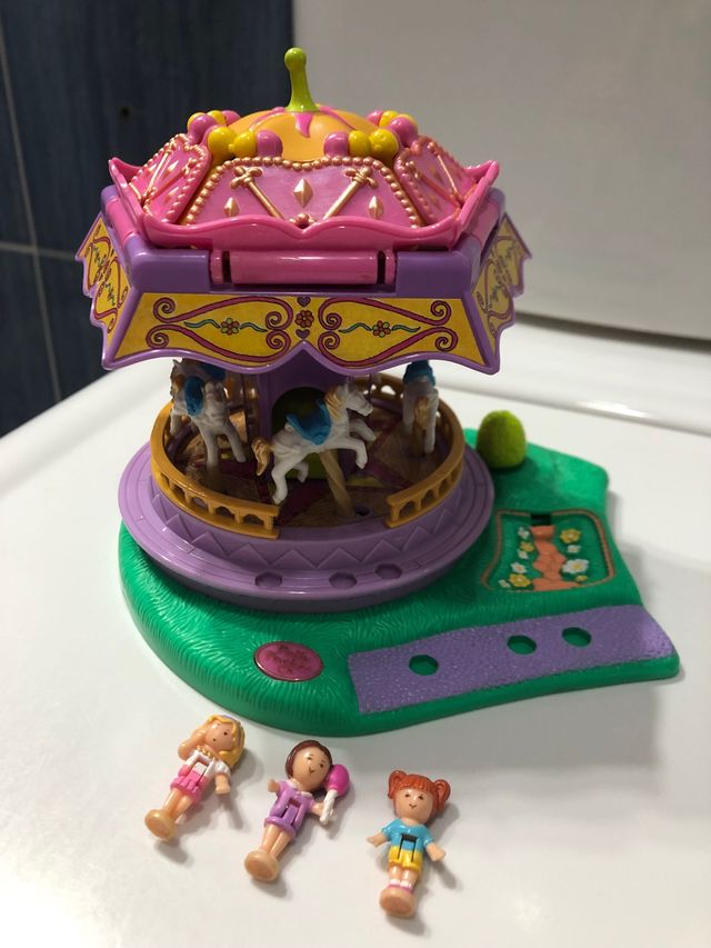 Product detailsPolly Pocket Fun Fair Spin Pretty Carousel. Original. Bluebird. Del año 1995. Vintage. Carrusel. Caballitos. Accesorios: carrusel, muñeca Polly y dos amigas. Falta el puesto de tíquets de la entrada (FOTOS 1, 2 y 7). En muy buen estado. La Polly tiene algo borrada la cara por el paso del tiempo (FOTO 10).