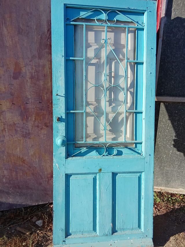 Product detailsPuerta exterior de madera pintada en color azul, con un diseño clásico y una reja decorativa.