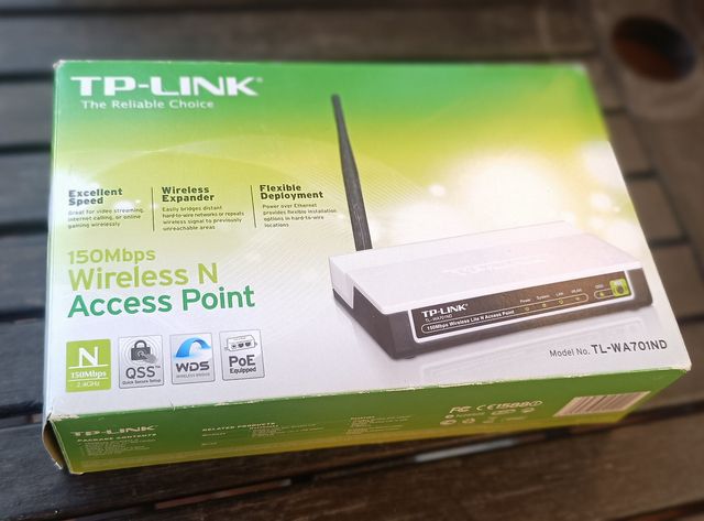 Punto de acceso wifi TP-LINK modelo TL-WA701ND/TL, de 150 Mbps. Puede generar una wifi propia en zona de poca cobertura (necesita una cenexión de red), hacer de repetidor o hasta seis modos diferentes. En su caja, con sus instrucciones, alimentador, cable de red y un adaptador POE. Practicamente a estrenar, muy poco uso.