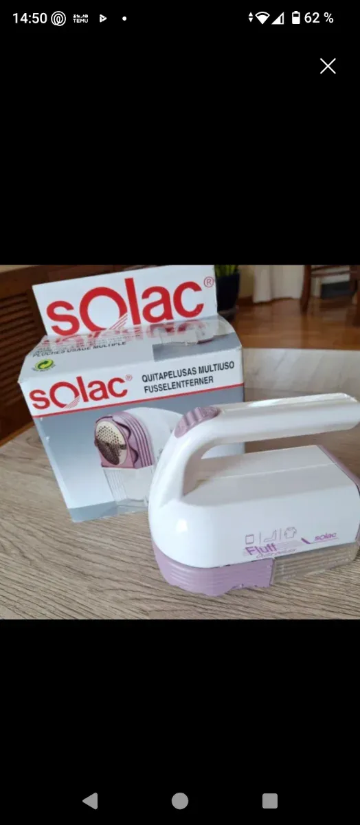 Aparato quita pelusas de la marca Solac. Ideal para mantener tus prendas como nuevas. - Diseño compacto y ergonómico. - Color blanco y morado.
