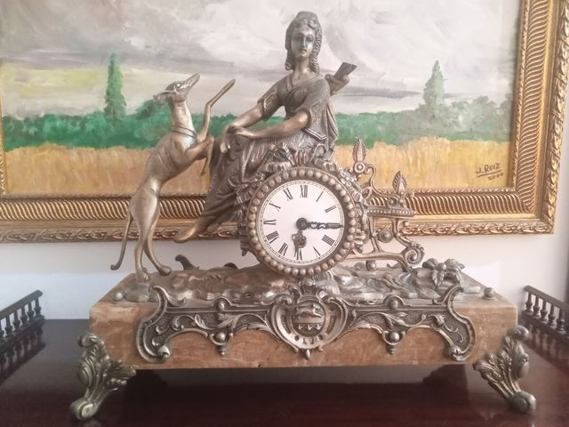 Reloj antiguo de bronce entero, funciona perfectamente, peana de mármol.