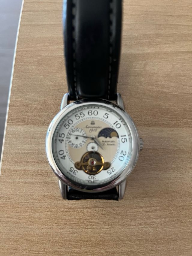 Product detailsReloj mecánico (automatico) de la marca Aeromatic 1912. Muy poco uso y estado muy bueno. Esfera 43mm anchura 12 mm. Clásico y elegante. Refleja el momento del dia segun la hora. Cierre de clip con la propia correa Product measurements