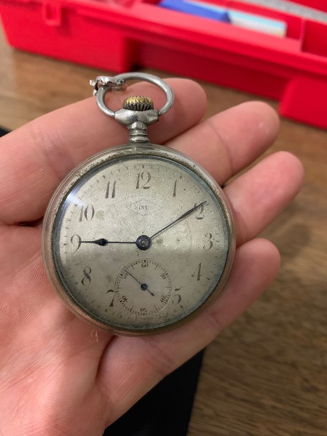 Product detailsAntiguo reloj de bolsillo marca Sinus, preciosa patina en el dial por el paso del tiempo, 49 mm de diámetro sin contar la corona. La corona carga y se puede ajustar la hora pero no funciona, necesita revisión y limpieza. MÁS RELOJES EN MI PERFIL.