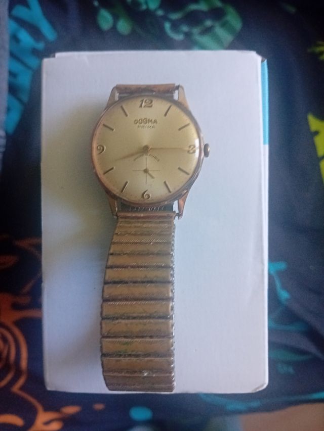 Elegante reloj Dogma con baño de oro. Un accesorio clásico y sofisticado. Funcionando perfectamente. - Esfera dorada. - Correa extensible metálica. - Diseño atemporal.