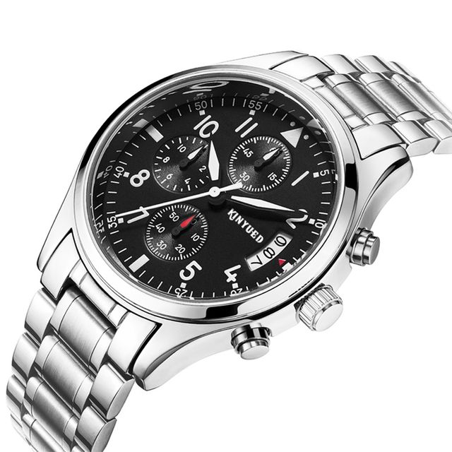 Product detailsElegante y funcional reloj Kinyued de caballero, en acero inoxidable, con correa en acero tipo armis, con cierre doble con pulsador, cristal de zafiro anti reflejos y anti arañazos, dial en negro con esferas multifunción y cronógrafo, con ventana de día a las 3.