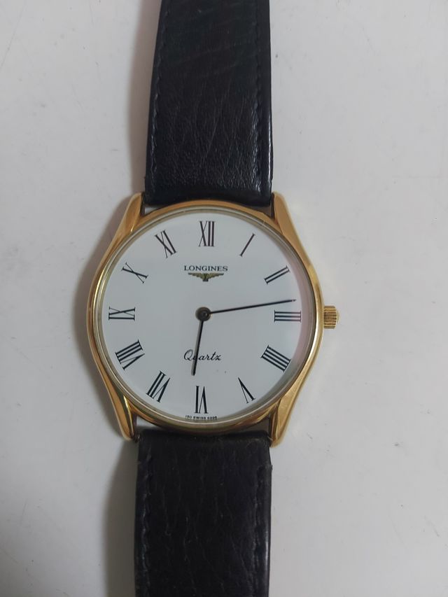 Elegante reloj vintage de la marca Longines con un diseño clásico. - Esfera blanca con números romanos. - Correa de piel negra. - Chapado en oro.