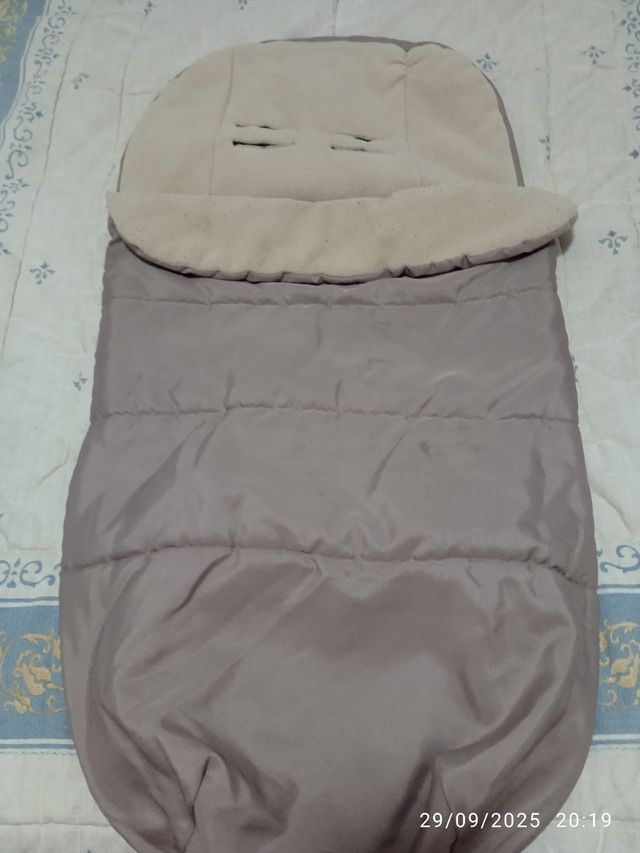 Saco universal para silla de paseo o cochecito. - Color beige. - Interior forrado de tejido suave. - Aberturas para arnés.