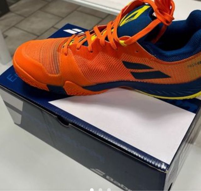 Product detailsVendo scarpe da Padel Babolat Jet Premura, nuove. Sono di colore arancione e blu scuro, con dettagli gialli.