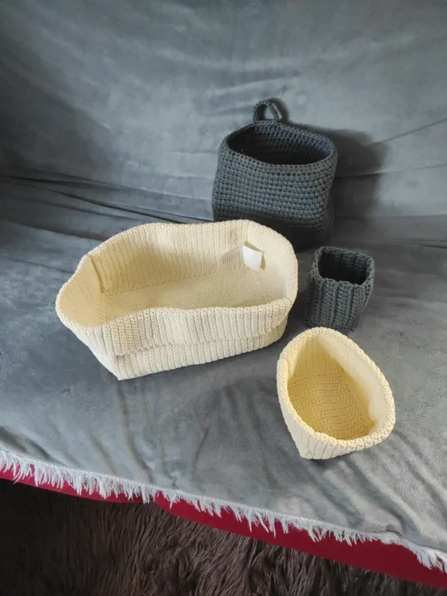 Set de 4 cestas tejidas a ganchillo beige y gris